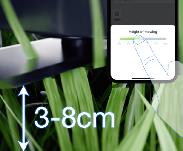 Lõikekõrgust saab mugavalt reguleerida otse rakendusest vahemikus 3–8 cm (1 cm sammuga), sobides ideaalselt Eesti murutingimustele.